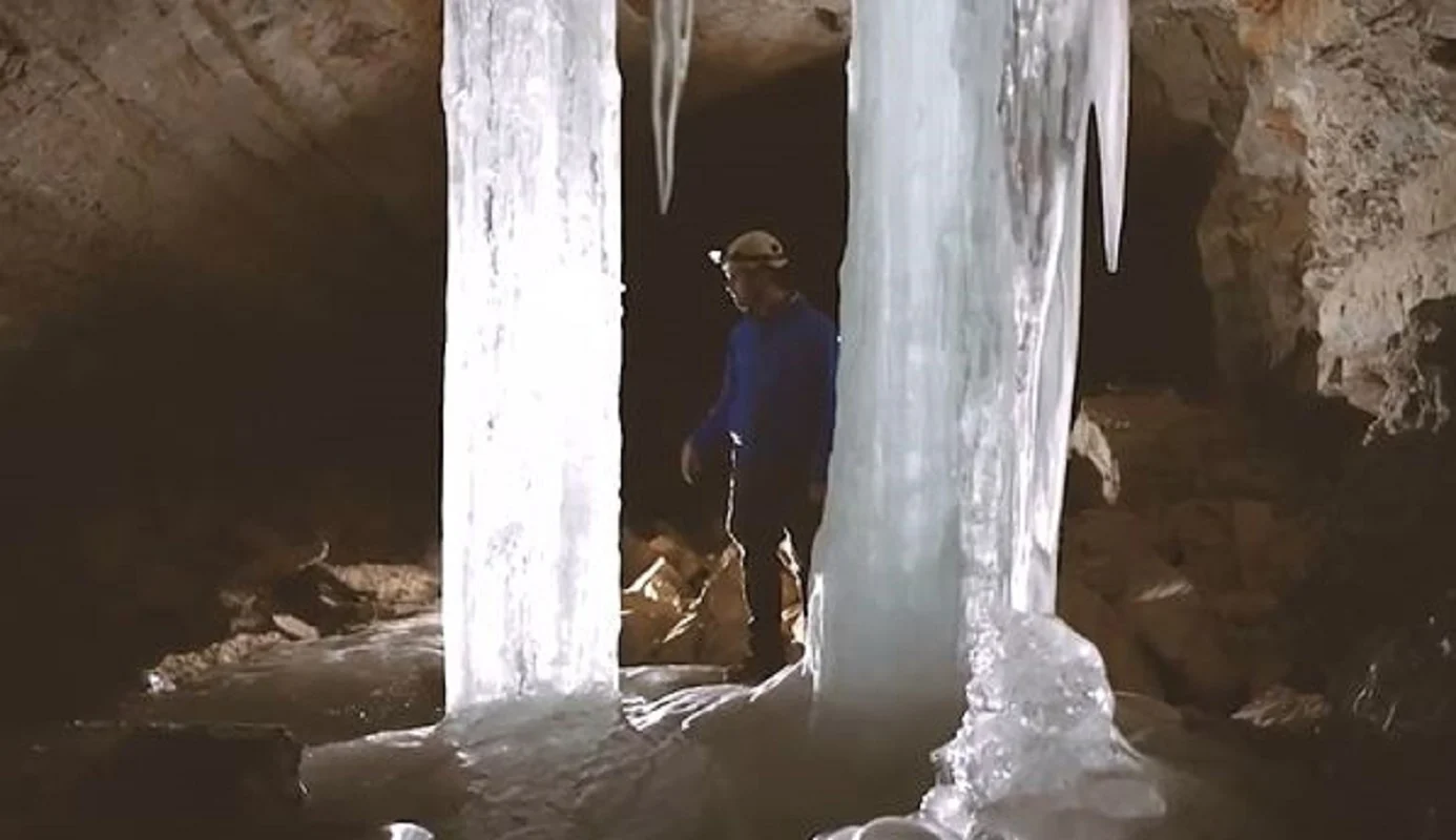 At a point where the light of day no longer reaches, twin pillars of ice join the floor and ceiling of the narrowing cave.