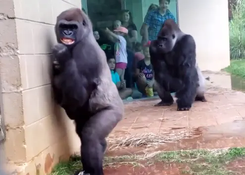 A viral video shows a number of gorillas hilariously skimming a wall in an attempt to dodge the rainstorm occurring over a zoo in South Carolina.