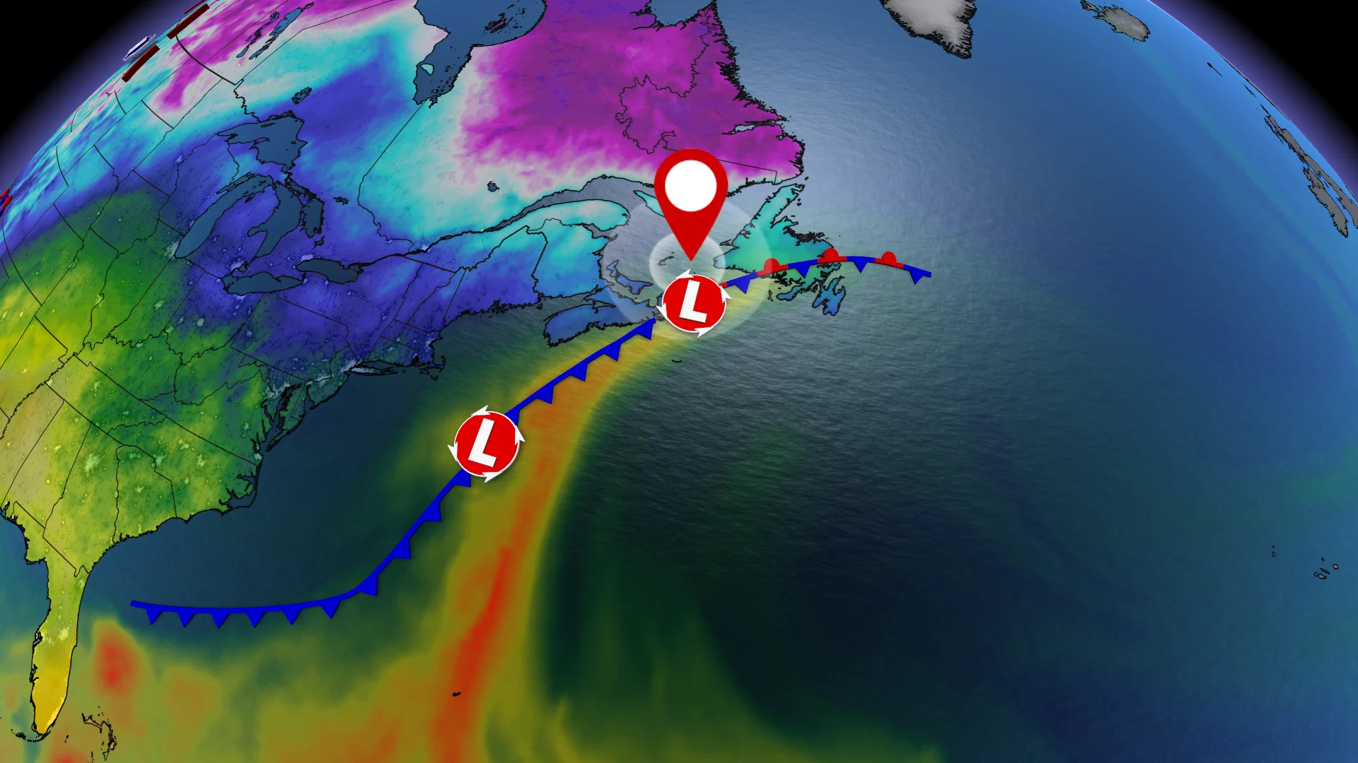 In Newfoundland, ice pellets and snowfall accumulations will persist through the day Friday. Blustery wind gusts of 60-80+ km/h will linger Friday evening in the Avalon and Burin, possibly increasing power outages amid blowing snow.